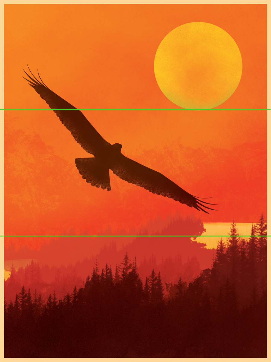 Next is the ‘Line of Action’ (LOA). The line of action dictates the direction your eye will move through the art. It also shapes the visual movement of the piece. As you can see in the example piece, the bird is looking at the sun (the focal point) and seemingly flying towards it like Icarus. This gives it motion, and your brain uses that information to make it move. Another important function the LOA serves is that it connects with the Grid Lines, creating a “Z” pattern, which your eyes automatically follow, and It doesn’t matter where your eyes start — it will follow the “Z.” Something else to make note of is the way the LOA divides the piece in two, and it separates the bird and the trees… Are you bored? Good.